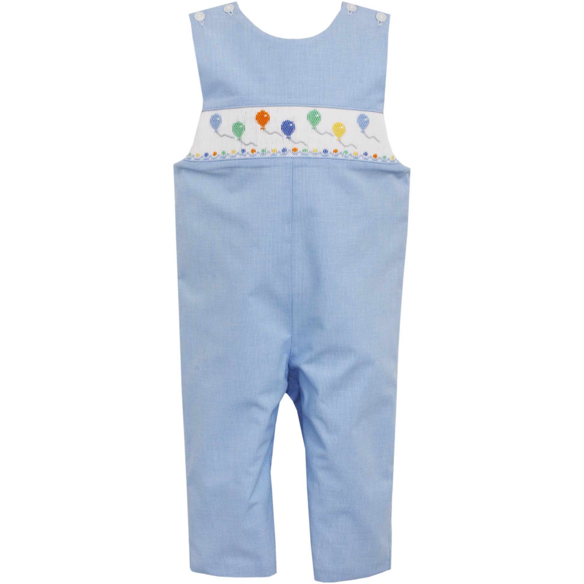 Boys Long Jon Blue Micro Check. Beautiful Smocked Colorful Birthday Balloons on Front. Buttons at top and Snaps at Bottom for Easy Changes.