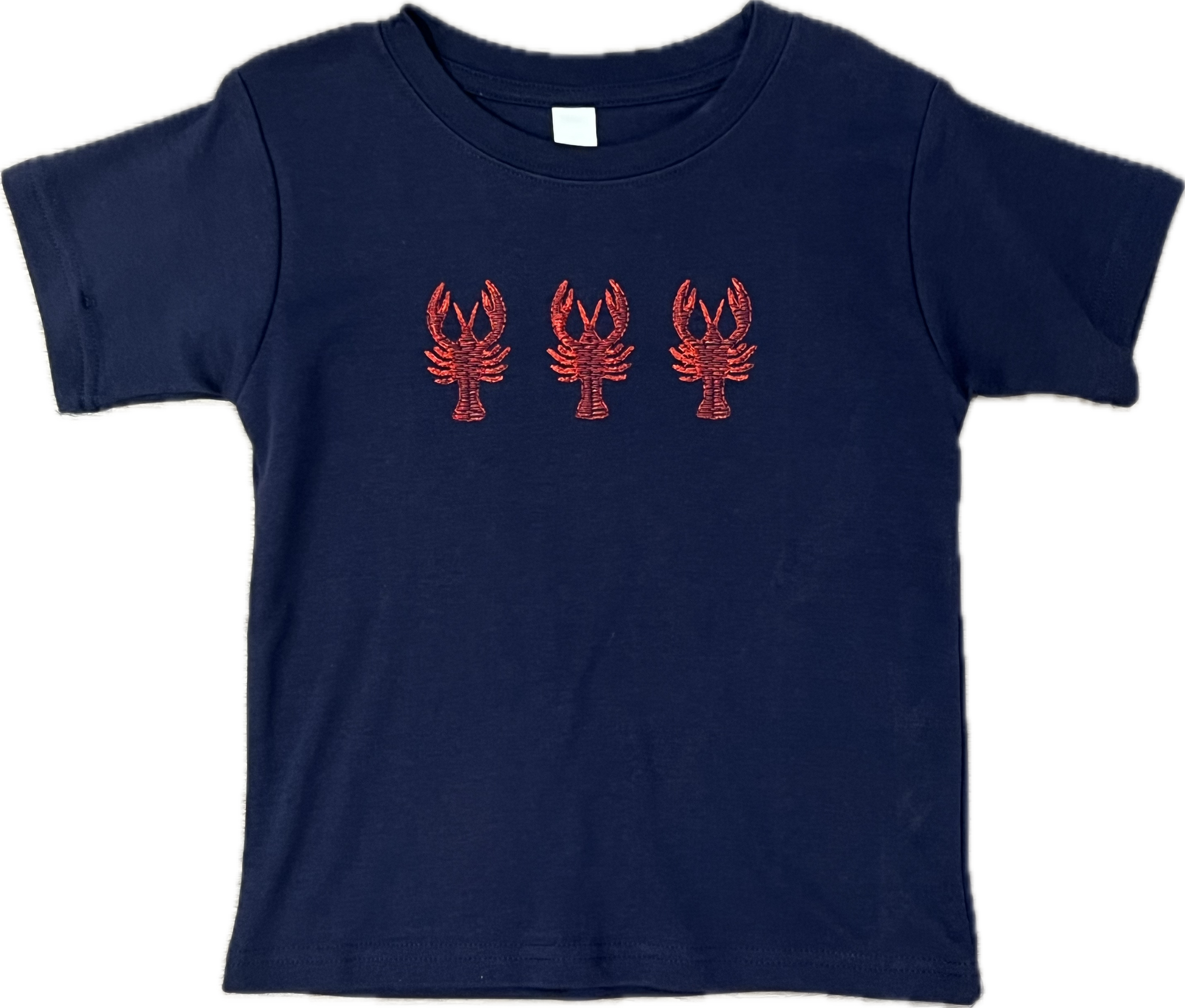 Boys Short Sleeve Crew Neck Shirt with 3 Embroidered Red Crawfish on Front.