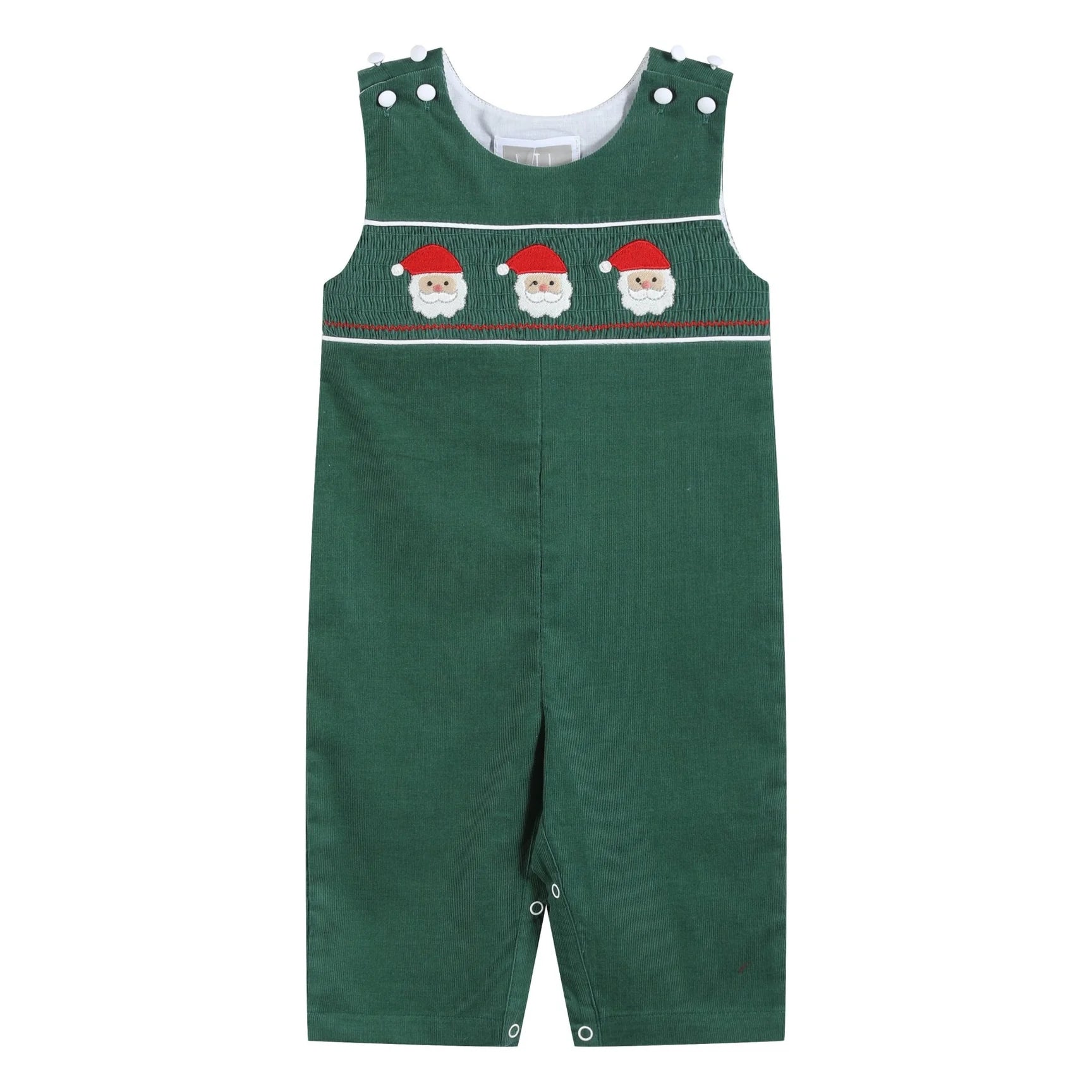 Elevate your little one's Christmas style with charming overalls featuring sweet smocking on the chest and embroidered Santas. Embrace the festive spirit with this delightful ensemble, perfect for creating cherished holiday memories. Snaps at the crotch make sure diaper changes will be a breeze and made in 100% soft cotton to ensure he is comfortable all day long. The perfect look for creating cherished holiday memories.