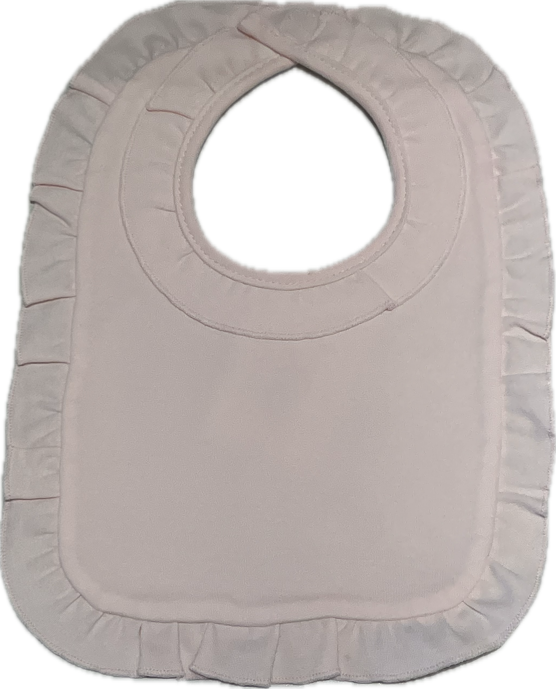 Soft Knit Bib with Velcro Closure. Soft Ruffle Around Entire Bib. Choose from Pink or White