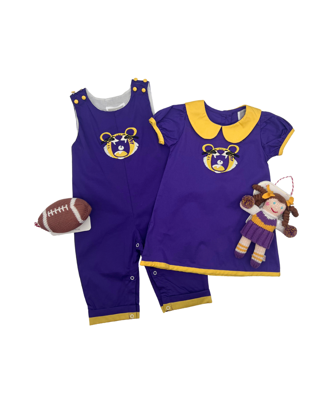 Show off your team spirit with our Louisiana Fan Overalls for your little tiger cub! Featuring a bold appliqué tiger, these football-themed overalls are perfect for game day enthusiasm. Let your little one roar with team pride in this spirited and stylish outfit.