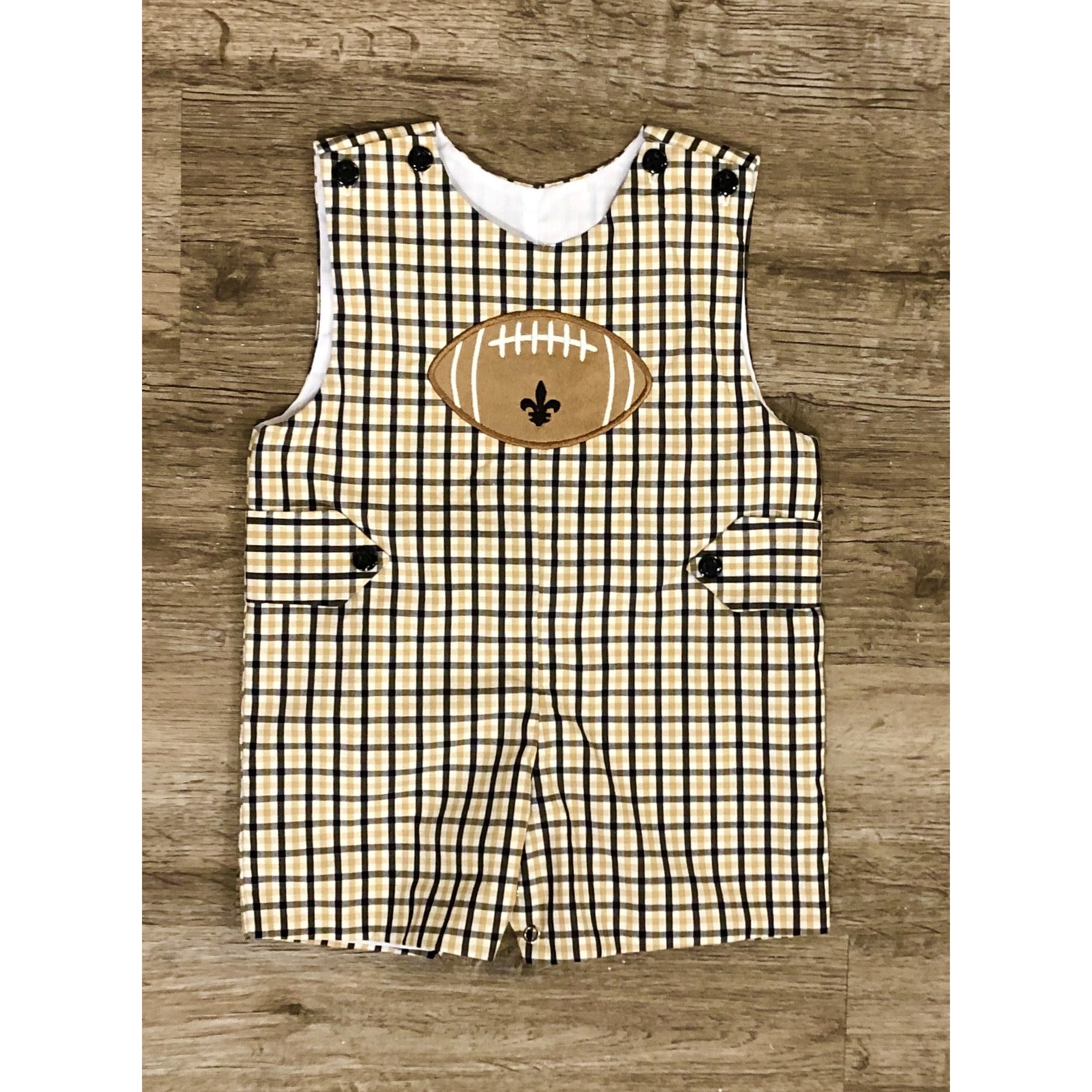 Boys Plaid Black and Gold Saints Shortall. Football Applique with FDL. Buttons at Top of Shoulder, Snaps for Easy Changes