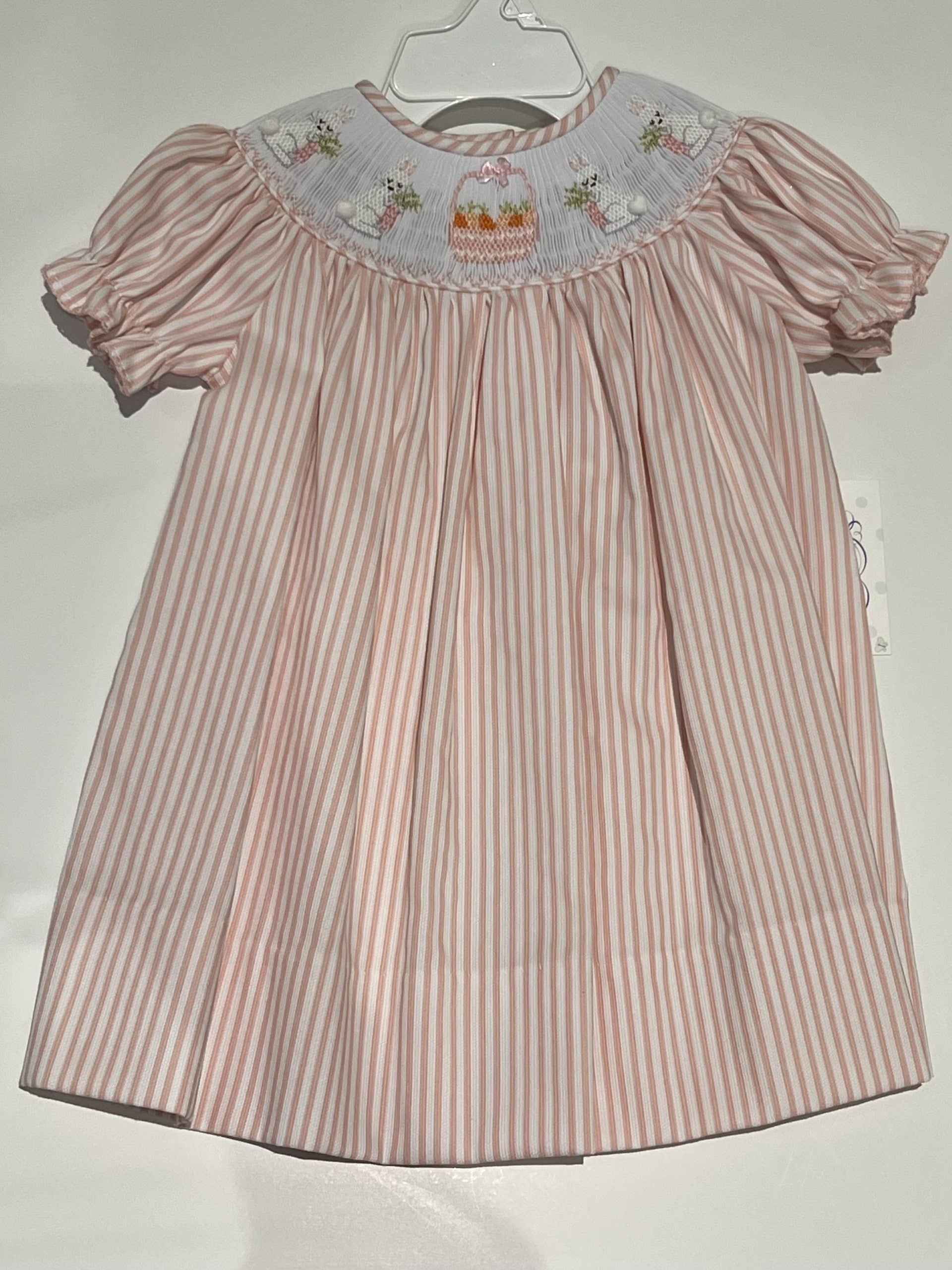 Lulu Bebe Smocked Bunny and Basket Bishop Dress. Pink and White thin stripe dress. Smocked Bunnies have White Fluffy Tail and Adorable Basket with embroidered Carrots. Perfect Easter dress!!!!