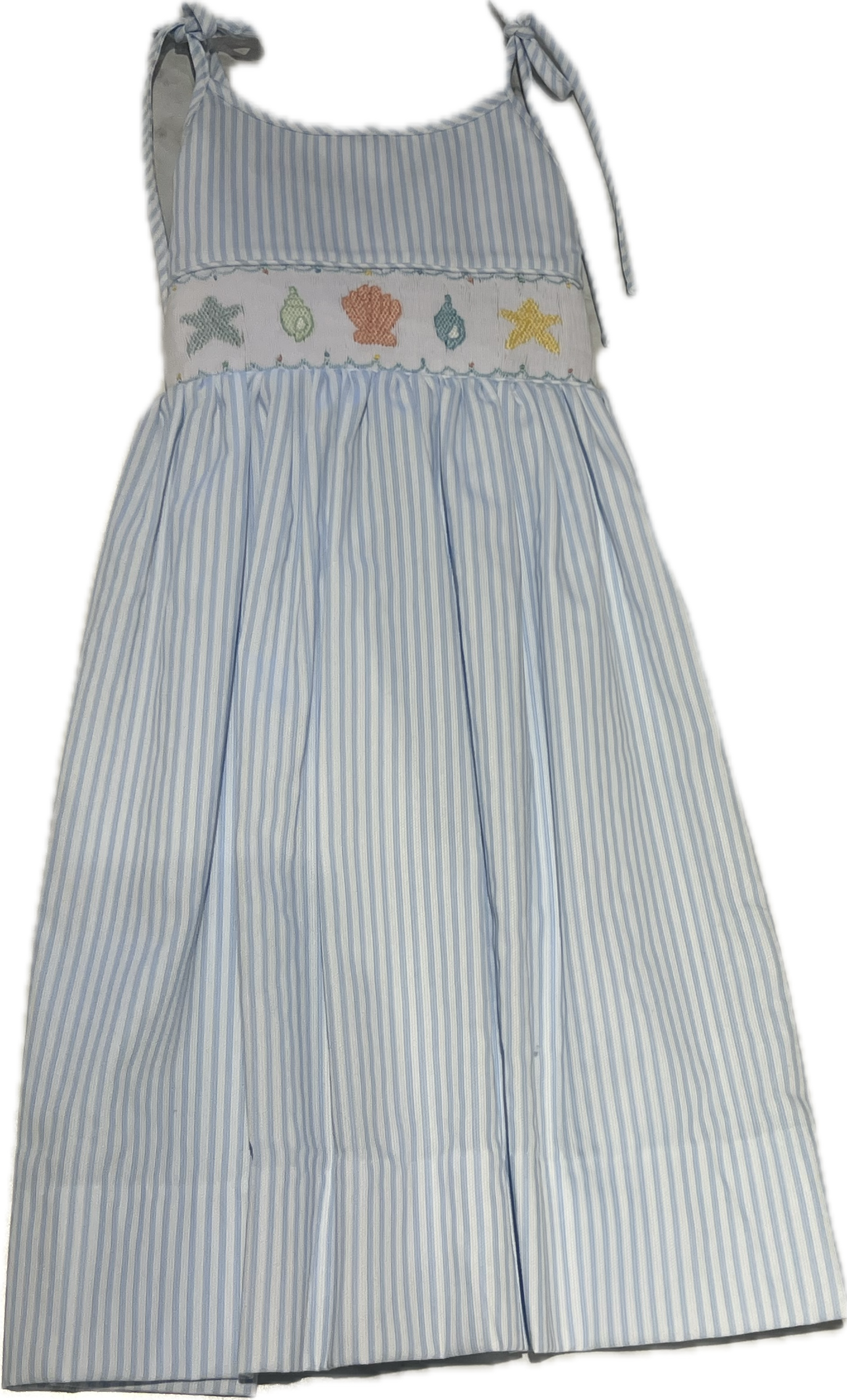 Girls Light Blue and White Thin Stripe Smocked Seashells on Front this Beautiful Shoulder Tie Waist Dress. Seashell are Embroidered in Beautiful Summer Beach Colors.