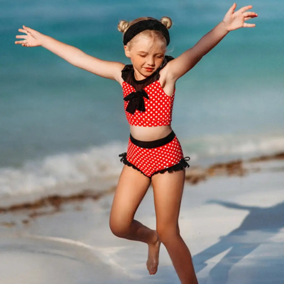 Made with SPF50 material An adorable high coverage two piece swimsuit with high waist and generously cut top. Features a signature red and white polka dot print, black ruffles and adorable bow accents! It may very well be her favorite swimsuit of the summer!