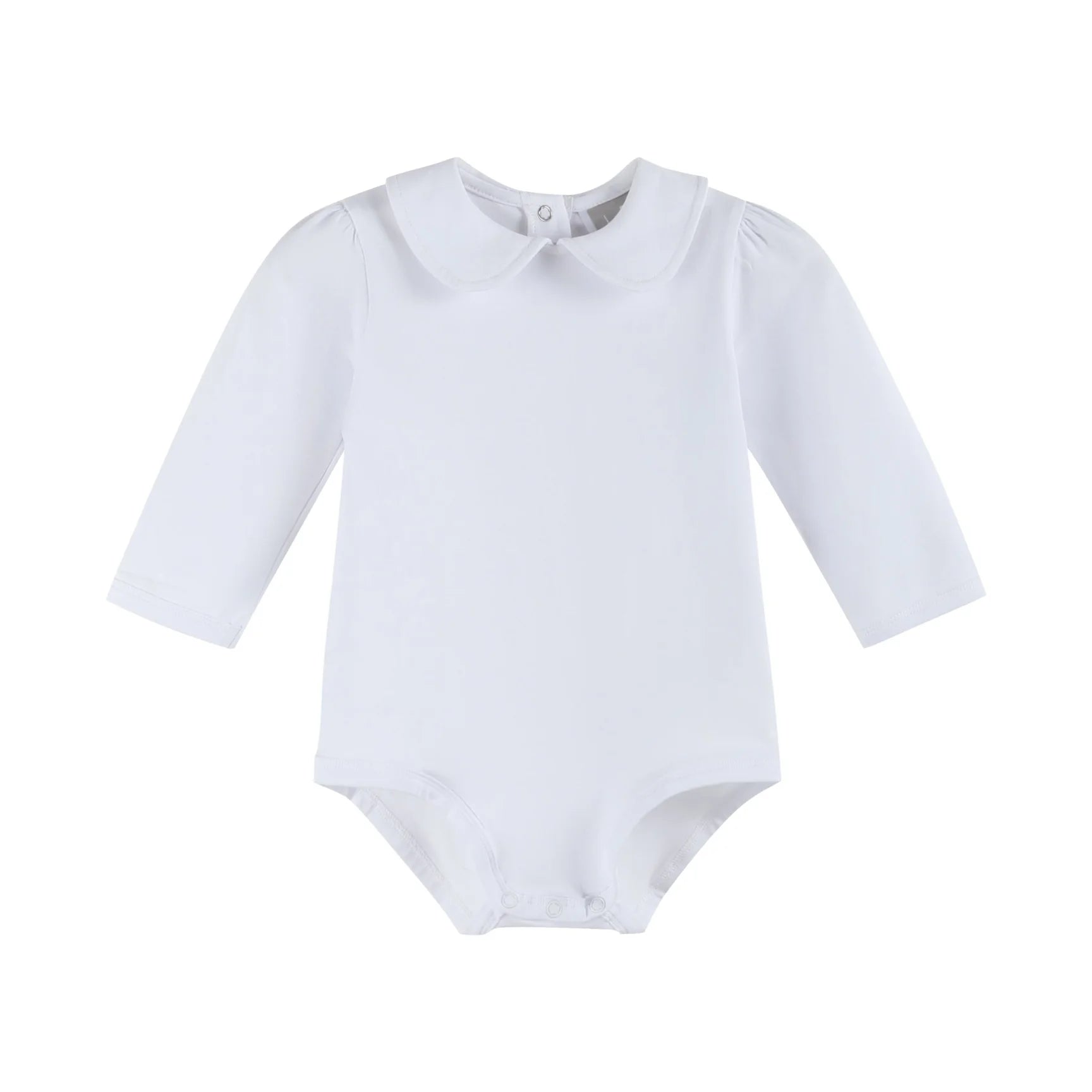 The perfect basic staple for your little sweetie's closet. A cute long-sleeved bodysuit made in the softest cotton. Detailed with a collar to make it the perfect option for under rompers, overalls or even on its own. This collared romper is also great for embroidery and monograms to make it a one-of-a-kind look. Sizing goes up to 2T.