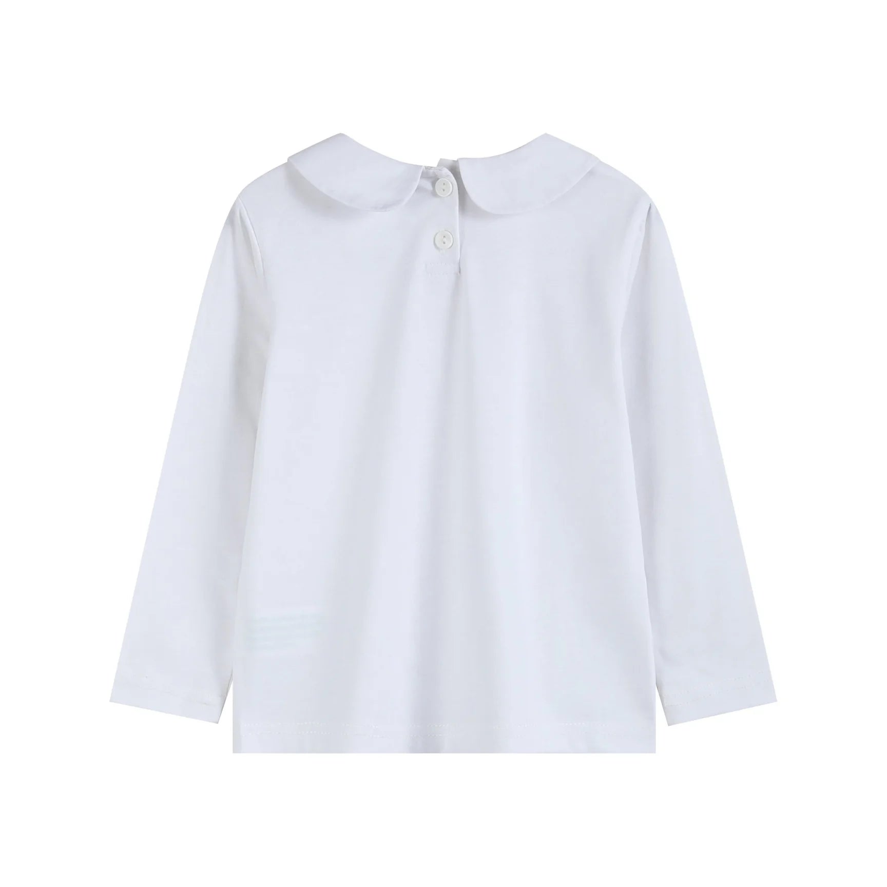 Celebrate the season with this White Cotton Santa Collared Shirt, perfect for little girls. Made from 100% cotton for comfort and softness, this long-sleeved shirt features an adorable collar embroidered with festive Santas.