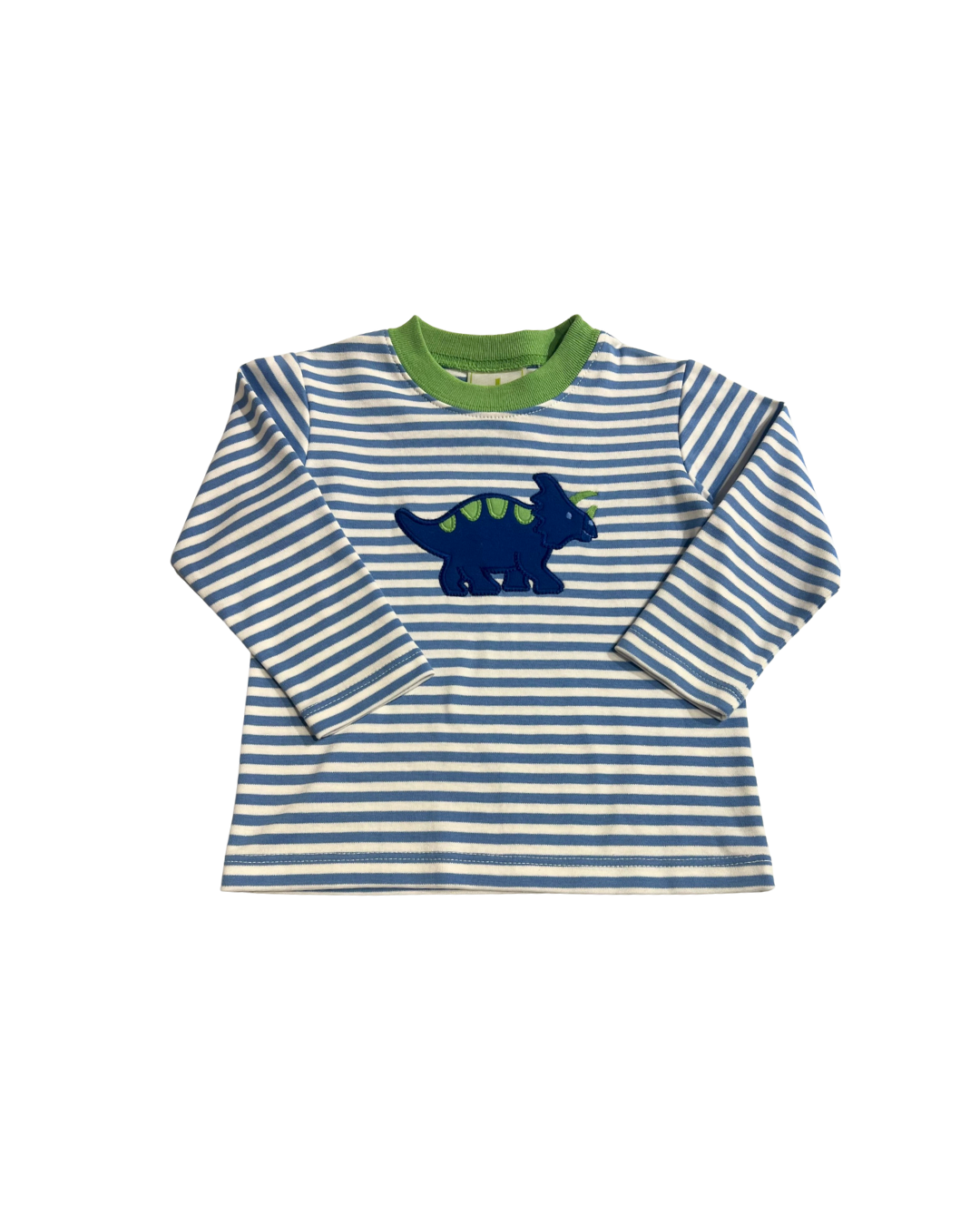 Boys Knit Harrys Long Sleeve Blue Stripe Crew Shirt with Dinosaur Applique on Front, Light Cloud Blue and White Stripe